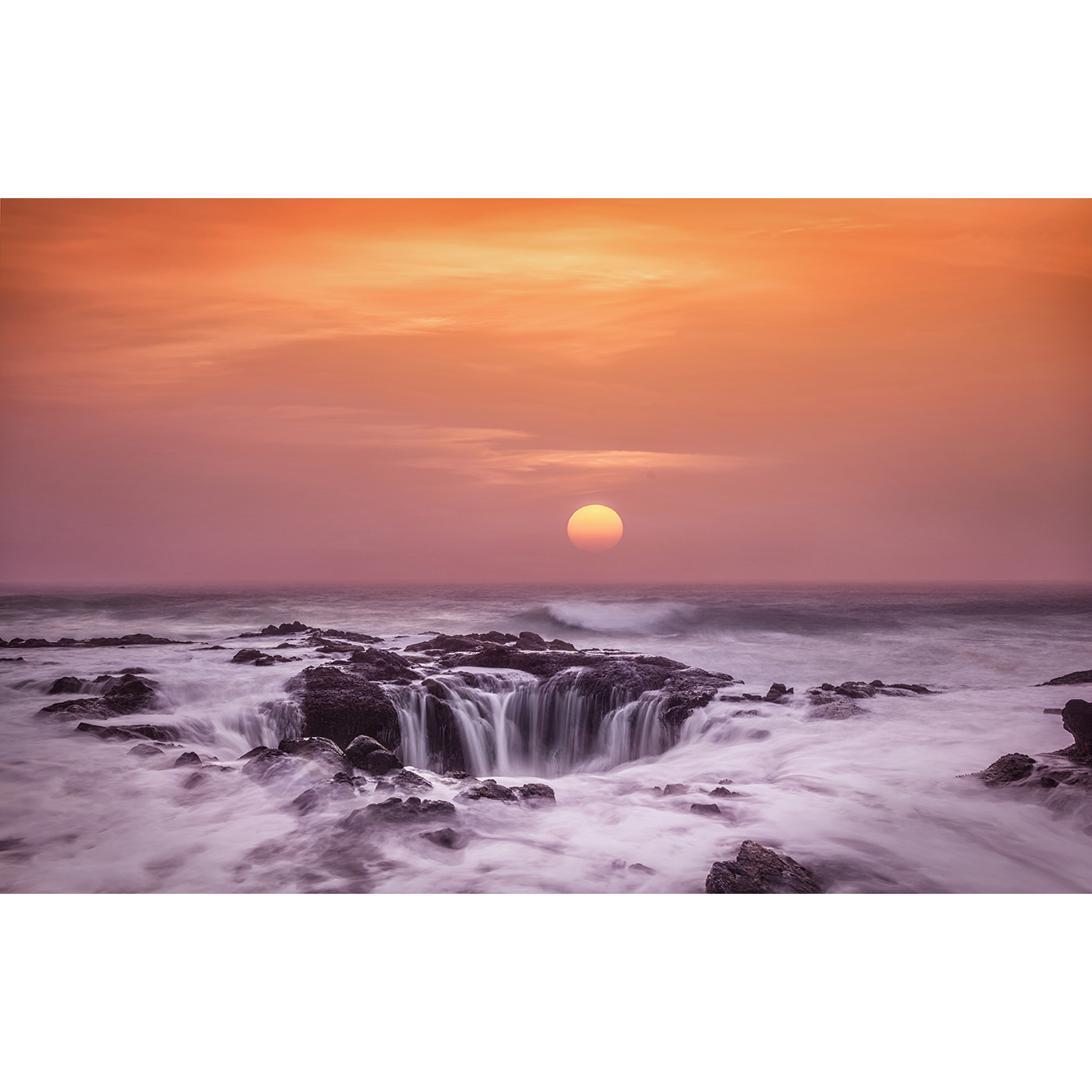Capture of the power of Thor’s seawell with massive sets of waves pounding the south-central coast of Oregon, as the sun sets calmly and colorfully over the Pacific Ocean