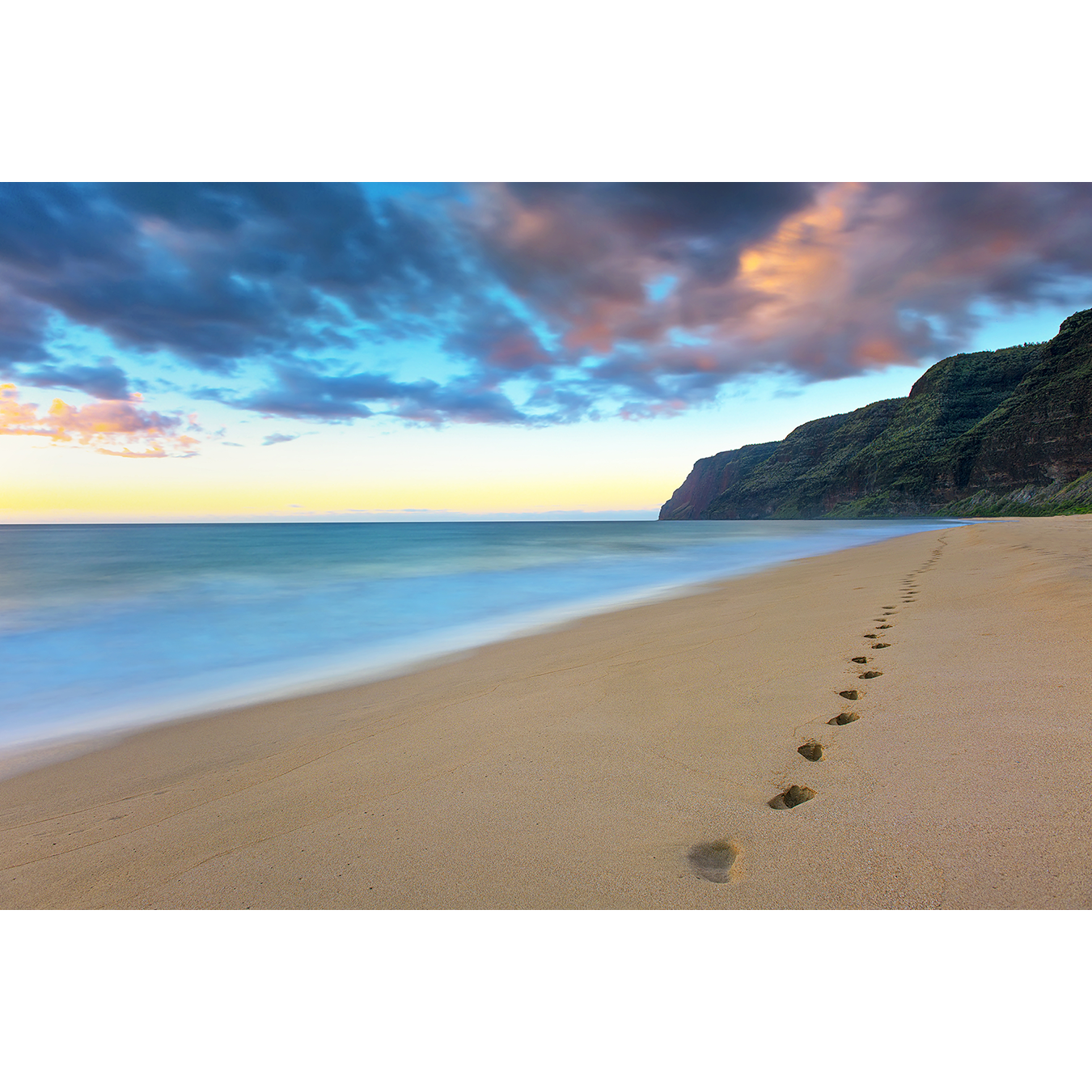 Heavily influenced by Salvador Dali’s masterpiece painting of the same name... This particular trip to the hawaiian island of kauai was full of memories that I’ll never soon forget. If you look closely at my photo here, the color tones, the mood, the layout of the composition with the placement of the beach, water, and cliffs exists similarly in dali's masterpiece... I have footprints that take you on a journey into my picture