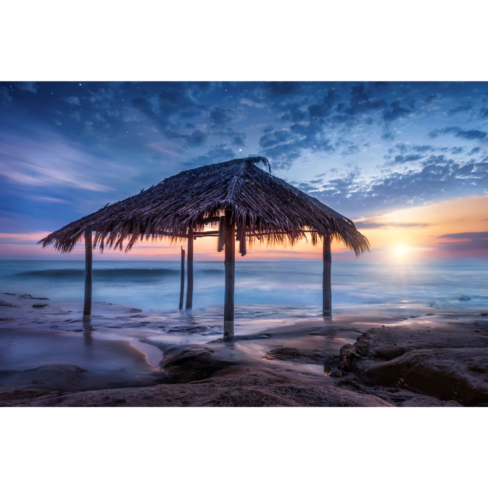 A beautiful palapala at sunset (with Jupiter and Venus in the sky) and high tide sits on Wind-N-Sea beach in La Jolla, California