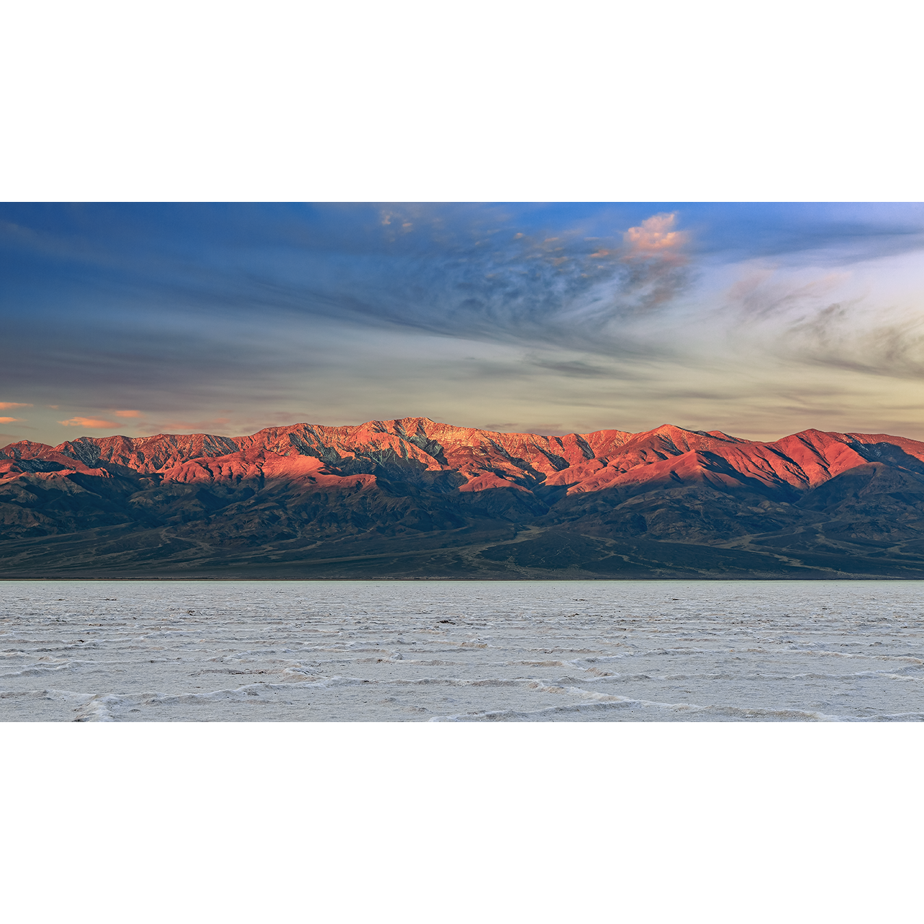 Death Valley is far more colorful than one might imagine it to be. Taken at sunrise, as the first light begins to work its way down the Panamint Range to the west, I am struck by the rich red color of the mountains, contrasted by both the blue sky and the white salt flat. Of course, mid-day these colors are far more muted and similar, but the temperatures even in winter, can make a visit here daunting!