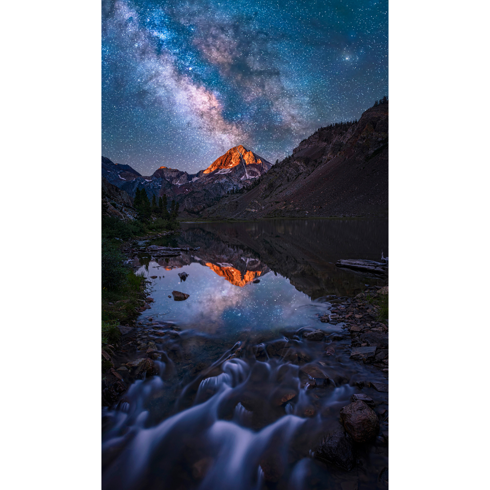 this impression was captured in the eastern sierra of california on july 4th, 2021...under the stars at 11:11pm and also 11 mins after sunrise at 5:55am...this composition is comprised of one long exposure of the lake and the mountain (f/11@111mm for 111 secs, iso-64) merged with a separate exposure of the stars taken in the middle of the night (f'/1.4@24mm for 15secs, iso-1600)...