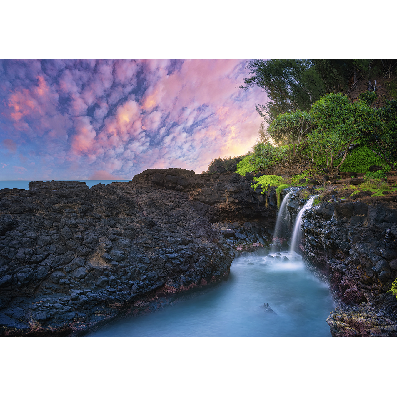 This impression was captured in one single exposure taken just after the sunrise on the east shore of Kauai, Hawaii (at 6:36am hst on April 15, 2022)... The image of this seascape is a quasi-long exposure (f/11@14mm for 33 secs, iso-64)...