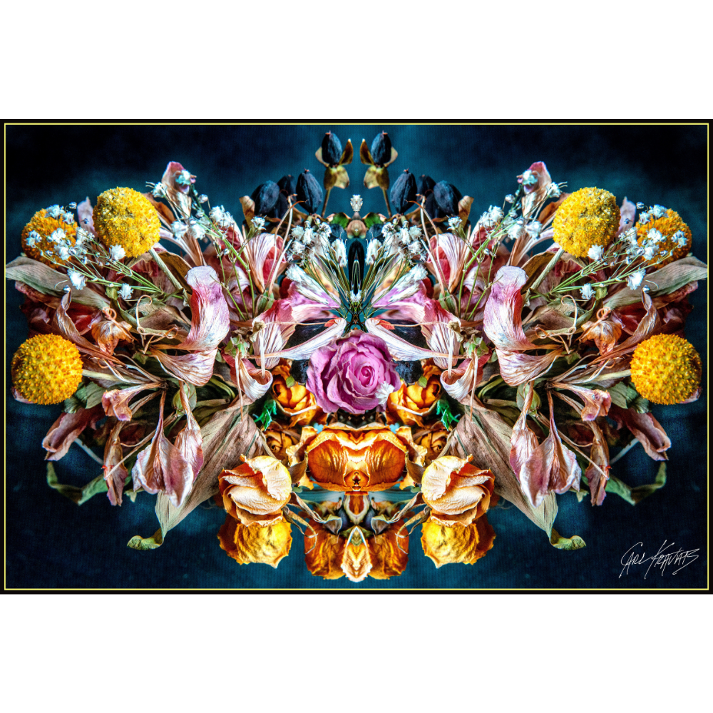 Here are mostly dried flowers. What I really like about this image, are those yellow Craspeda’s (Yellow Drumstick Flowers) I have no idea where I got them from. These were photographed in a vessel, shooting straight down with a blue cloth surface. I put the Pink rose in at a later date. Hence, the name.