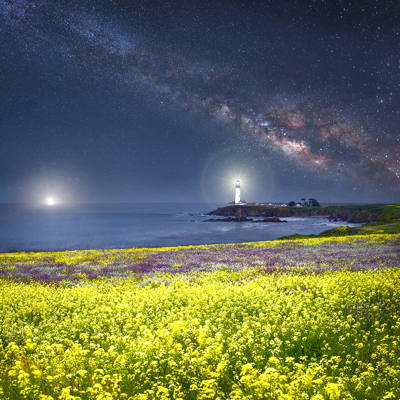 Pigeon Point Lighthouse near Pescadero, CA about 30 miles north of Santa Cruz and an hour south of San Francisco bay... The flowers in this impression were captured in April when the coastal spring wildflowers on the south side of the point are in full bloom...