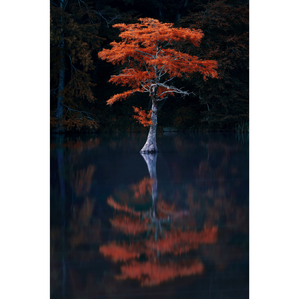 An elegant cypress tree reflecting its beautiful autumn colours in a stream in southeastern Oklahoma.