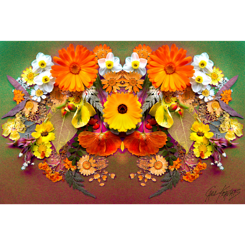 After I arrange flowers on a surface using real, dried and dried pressed flowers, I use photoshop to mirror the image. After I do that, I create a number of actions. In this case only the colors. And I love those little Daffodils.